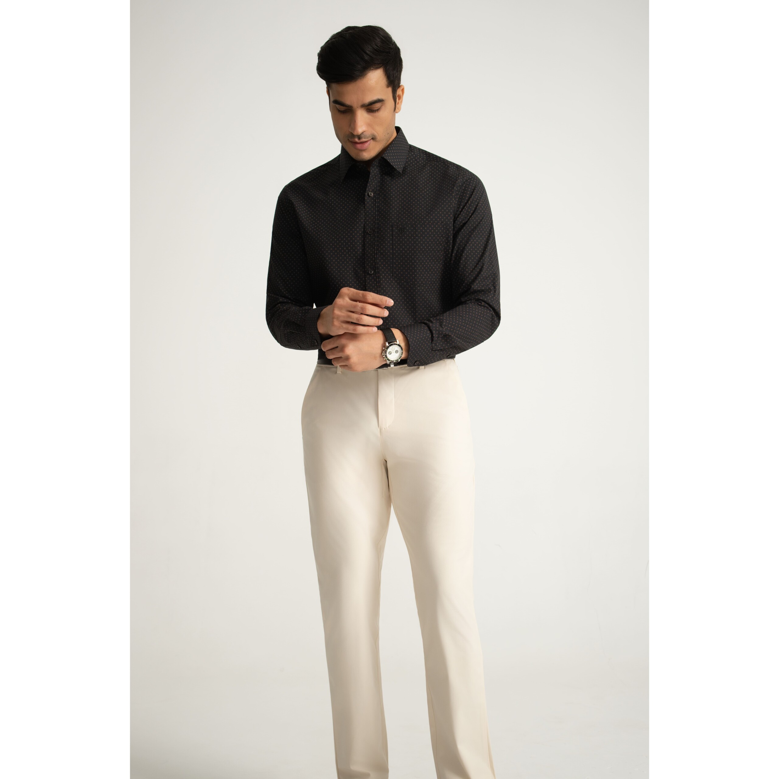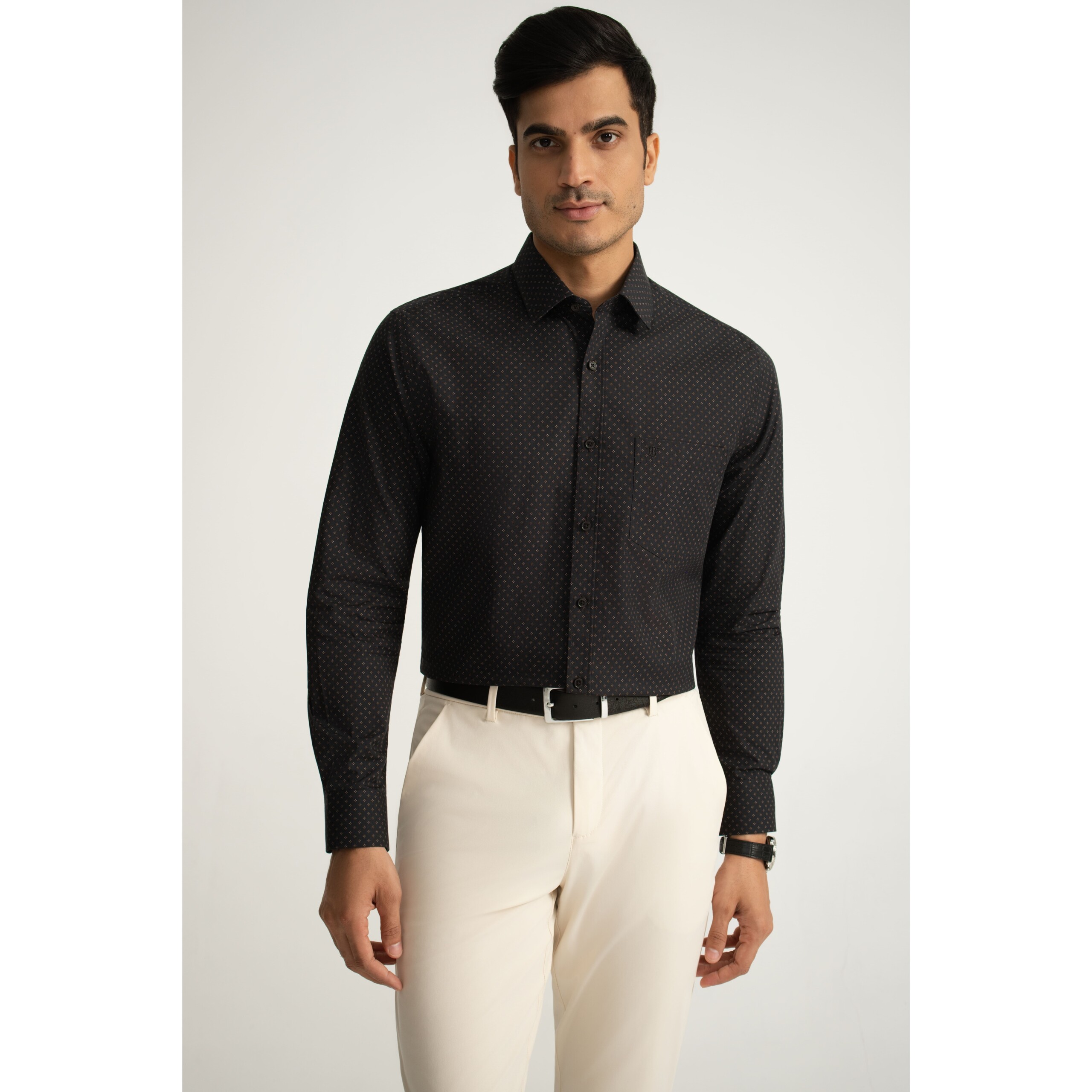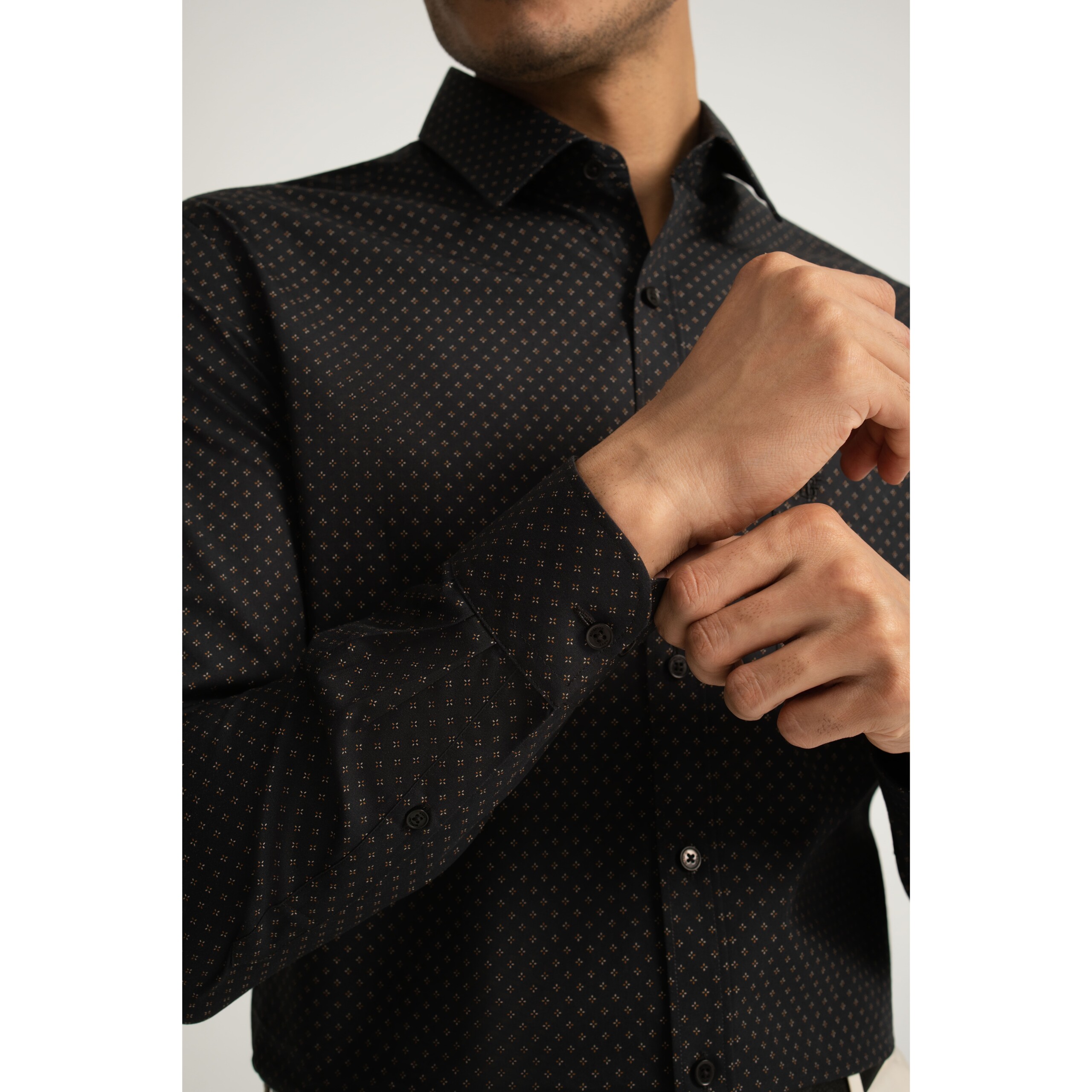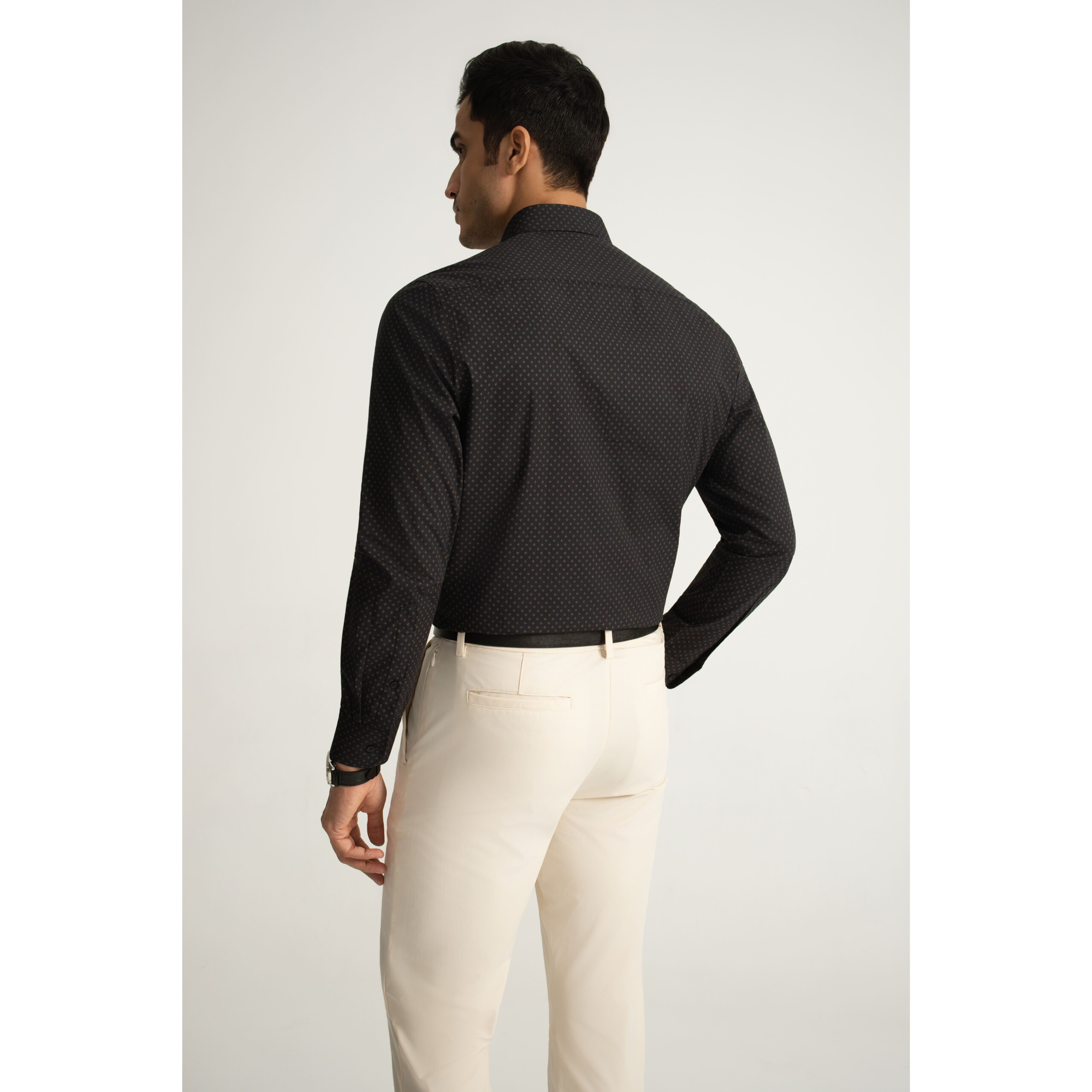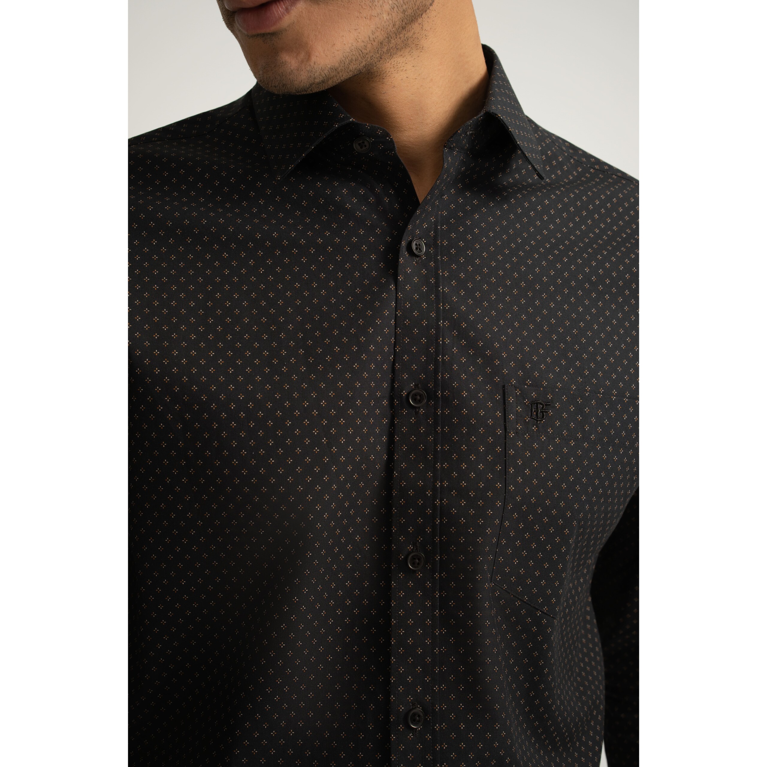 A black long-sleeve shirt in cotton poplin, finished with a sharp point collar and modern geometric star print. From the BF Navy collection.